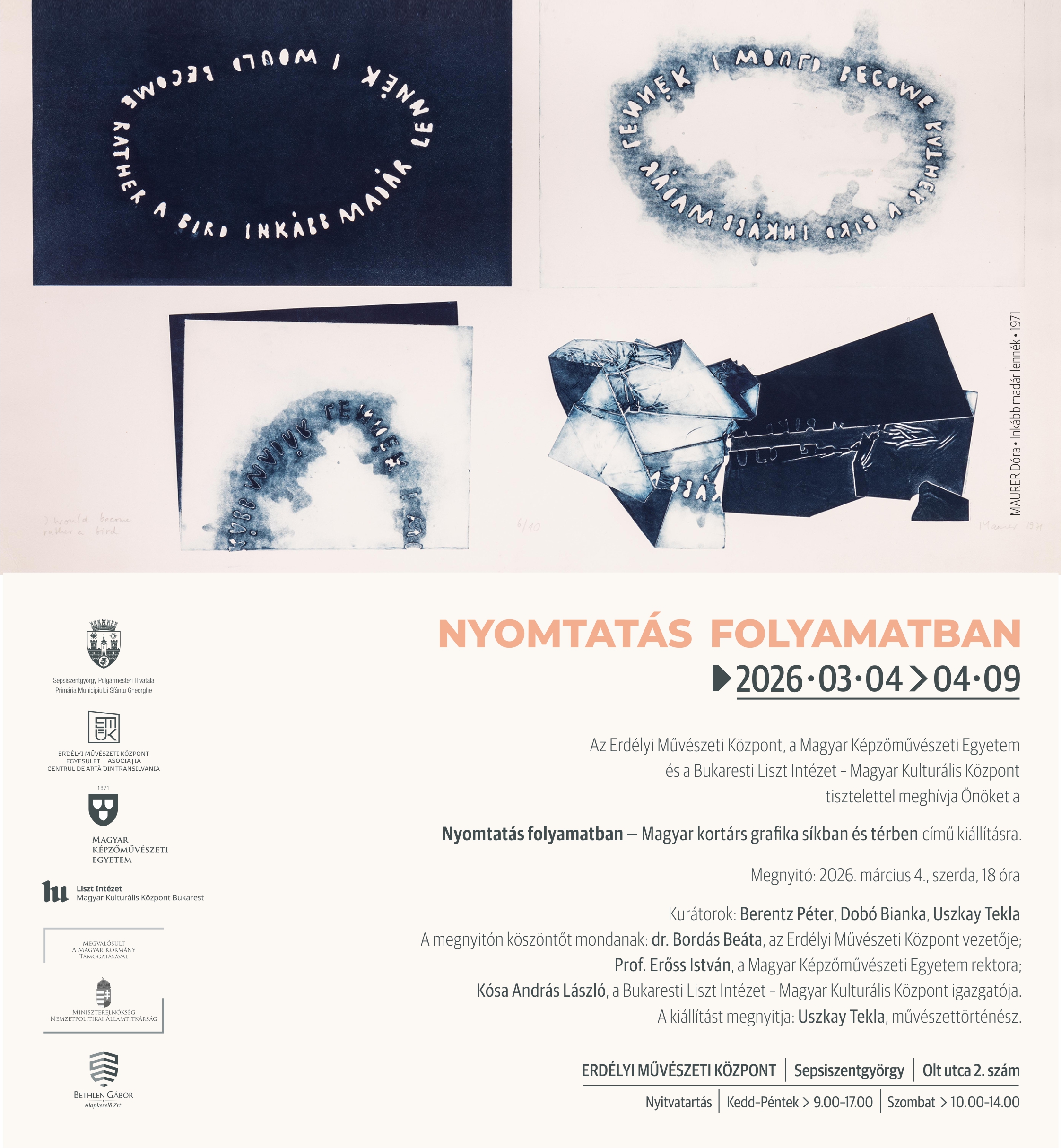 A sepsiszentgyörgyi Erdélyi Művészeti Központban nyílik meg a Nyomtatás folyamatban – Magyar kortárs grafika síkban és térben című kiállítás, amely a kortárs magyar grafika elmúlt négy évtizedében történt átalakulásáról és műfaji sokszínűségéről szeretne átfogó képet bemutatni.